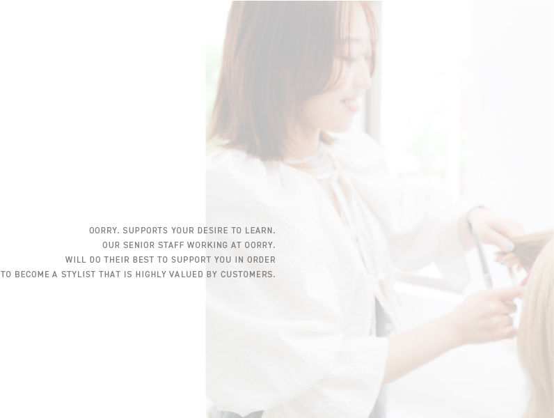 店舗によって歩合制の割合は異なりますが、OORRY.は働きやすい環境を目指すべく、割合を高めに設定しています。また、スタイリストデビュー後も一定の売上げに到達するまで、トップスタイリストがしっかりサポートします。